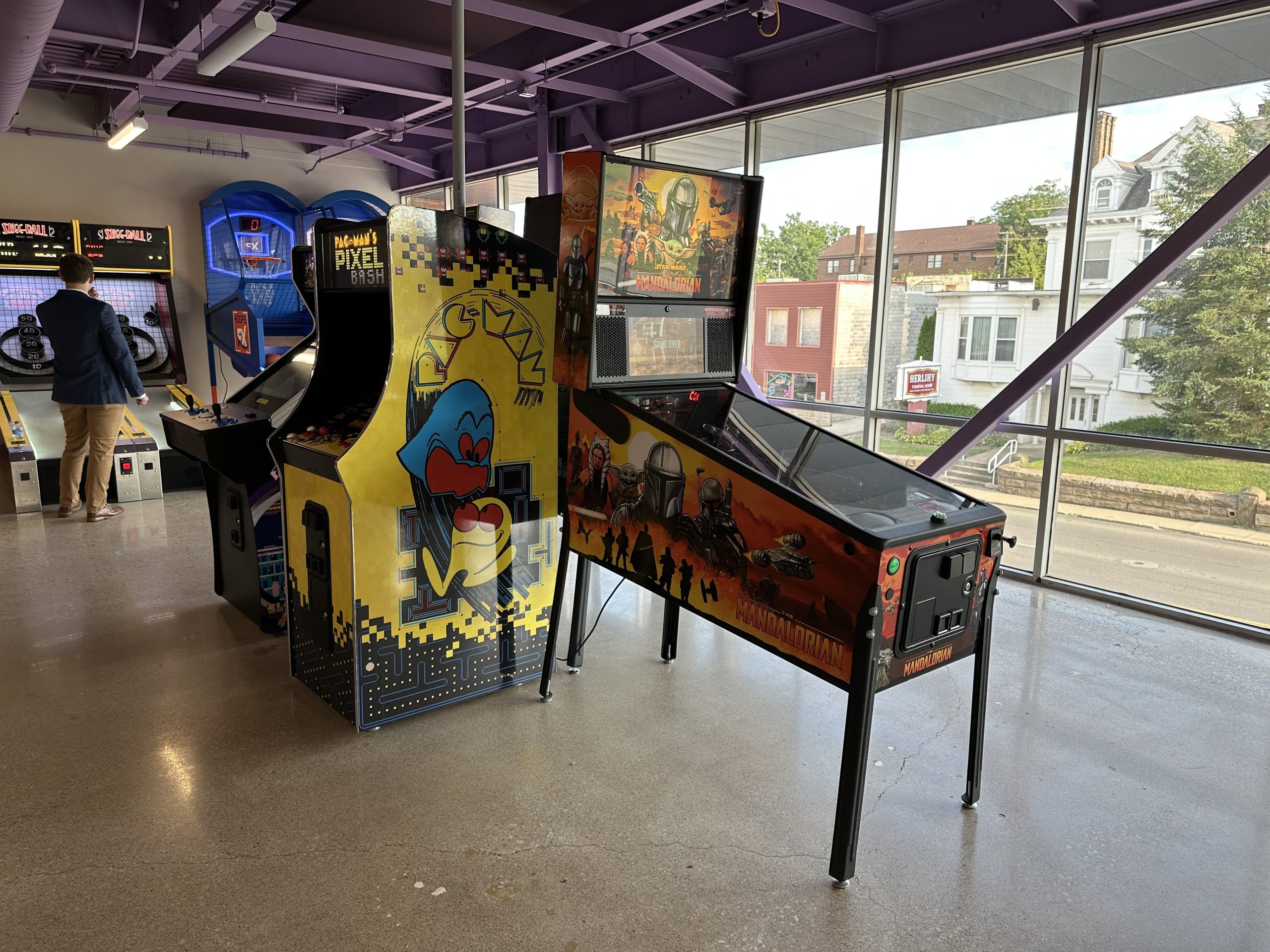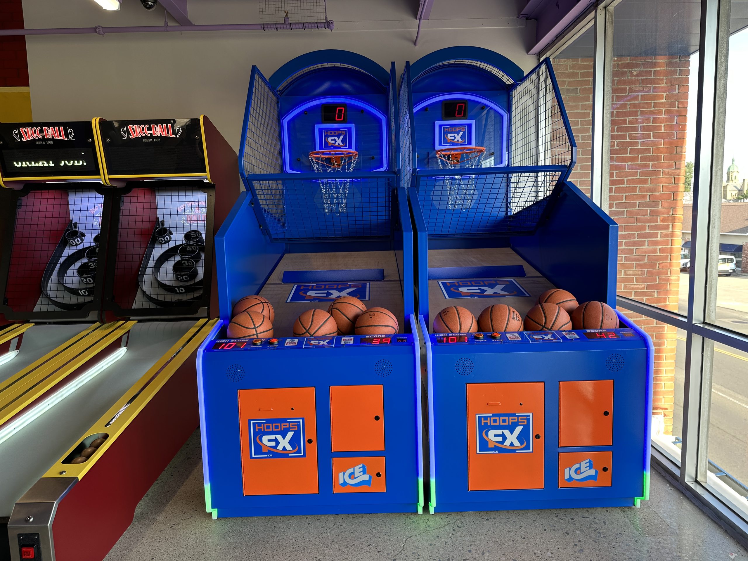 The second floor includes skee ball, Pop-A-Shot, laser racing tunnels, classic arcade and pinball machines, an air hockey table, paper airplane launcher and many more interactive games.