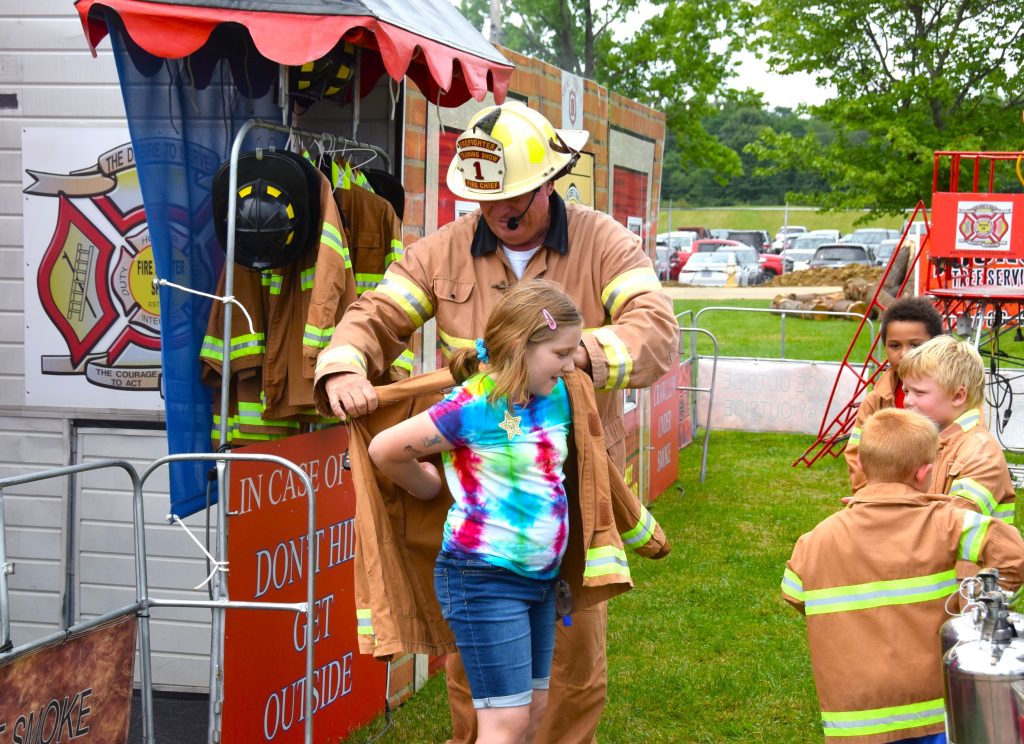 After each donned their firefighting jackets and helmets, the “alarm” sounded and each child — with coaching from Snyder — demonstrated how a firefighter may battle a small house fire.