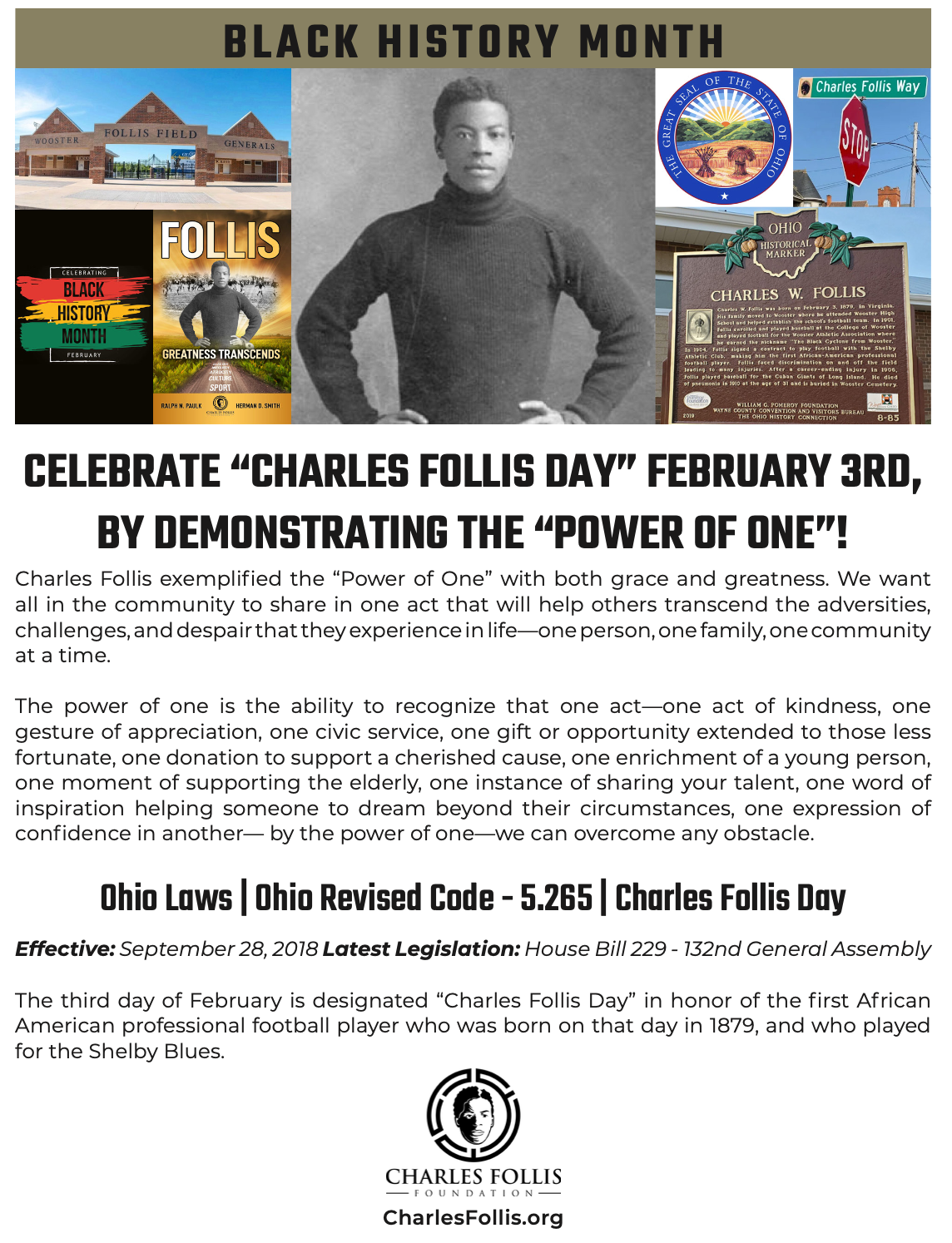 Former Ohio Gov. John Kasich in 2018 signed legislation approved by the General Assembly selecting Feb. 3 “Charles Follis Day,” to honor the 6-foot, 200-pound star who attended Wooster High School and helped establish the first varsity football team in 1899.