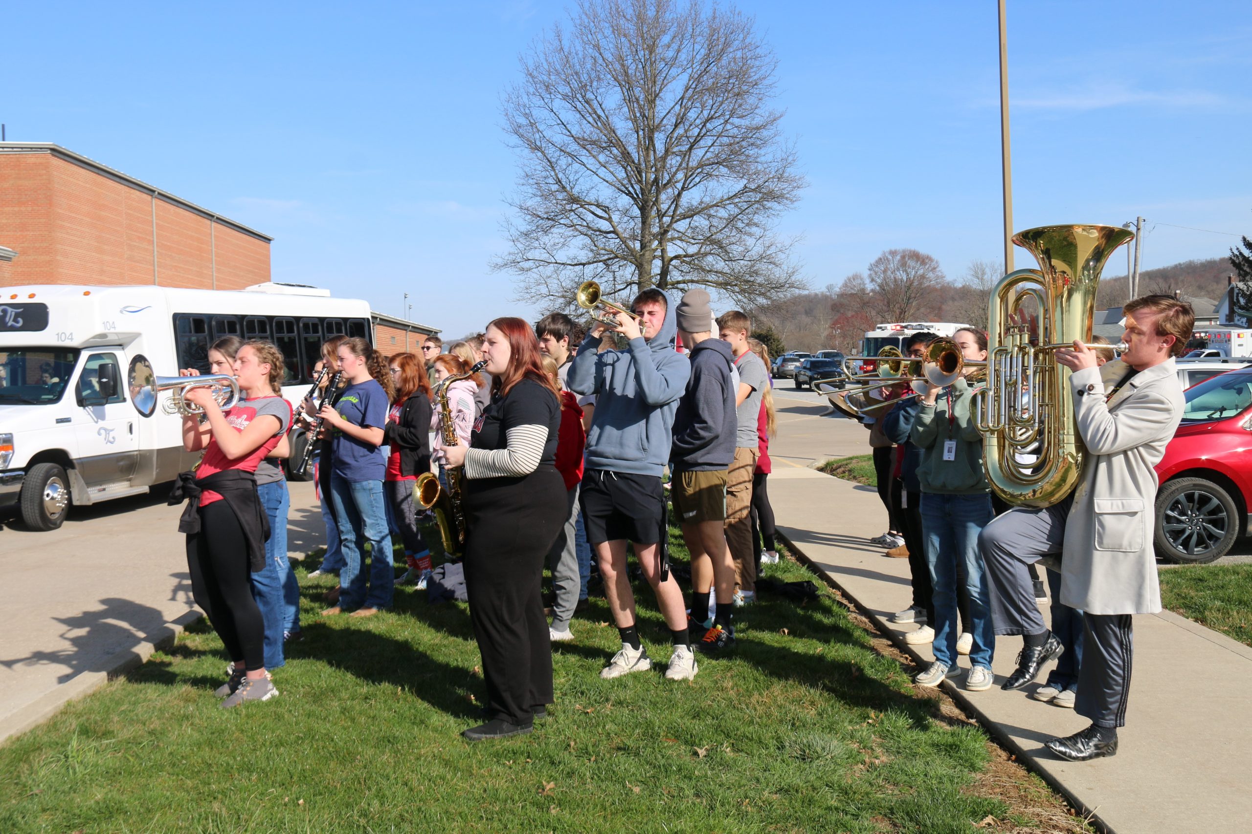 Students at the high school held signs for their friends and the marching band played as the procession left the parking lot. They made a circle through downtown Loudonville, where local businesses displayed posters to support the players.
