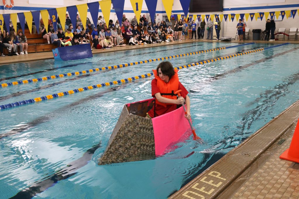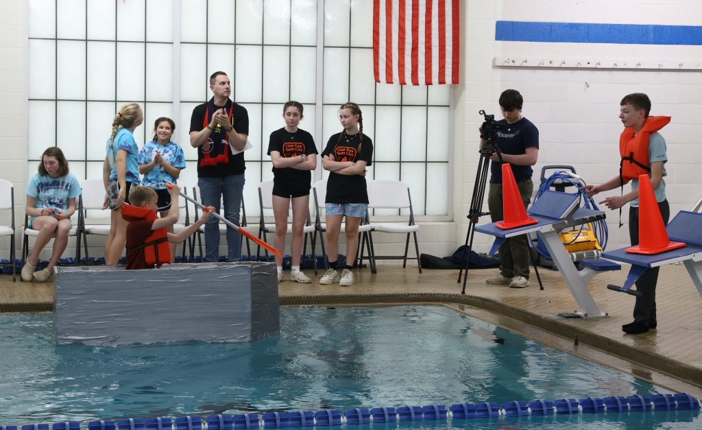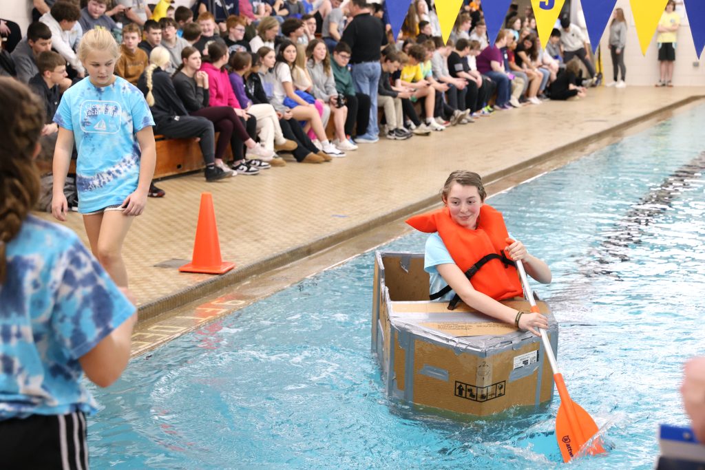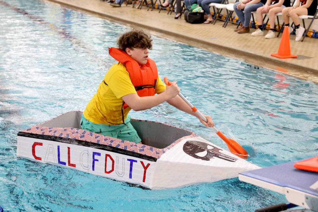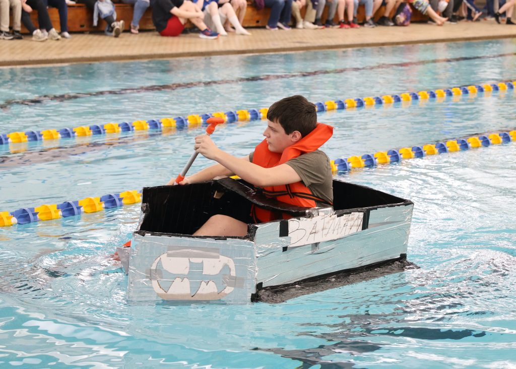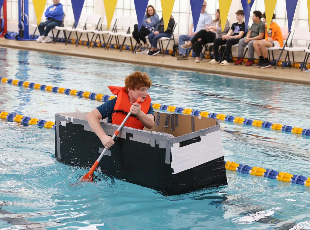 Close to 40 middle school teams competed in the Bruce Weirich Cardboard Boat Regatta Friday morning. Each team had three rowers who traveled one length of the pool, relay-style.
